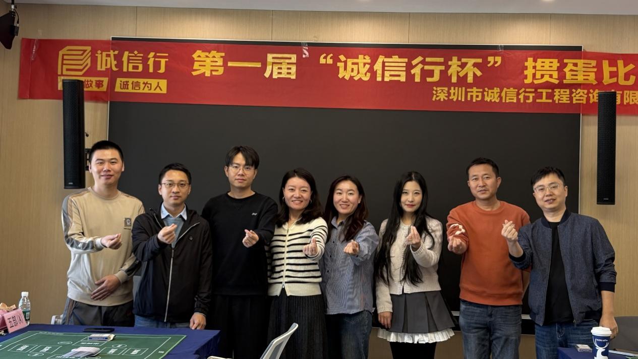 2025年11月29日上午9点40分,深圳市诚信行工程咨询有限公司全体参赛人员齐聚中海慧智大厦24楼公司大会议室,开启了第一届“诚信行杯”掼蛋比赛的序幕。任继伟书记代表董事长做赛前动员讲话,勉励大家以牌会友、以赛促融,遵循“公平竞争、友谊第一、比赛第二”的原则,提倡文明参赛,在竞技中彰显团队精神。大赛总指挥颜主任为比赛规则做出详细且专业的讲解,随后,全体参赛员工列队合影留念,定格下诚信行人朝气蓬勃、团结向上的精神风貌,为整场活动拉开温馨而专业的开场。